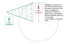 - Vision horizontale : vision symbolique et mathématique du 1 devenant 2, et le 2 élevé à la puissance 3, ouvrant ainsi en deux temps : d’abord à l’âme (4) puis au corps (8), concrétisation finale du Jeu de conscience.