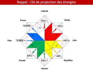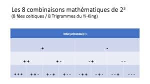 Cette vision symbolique et mathématiques, va nous donner une succession de gauche à droite du plus subtil au plus épais : 2 combinaisons pour le Feu, 2 pour l’Air, et ainsi de suite jusqu’à la Terre, en passant par l’Eau.